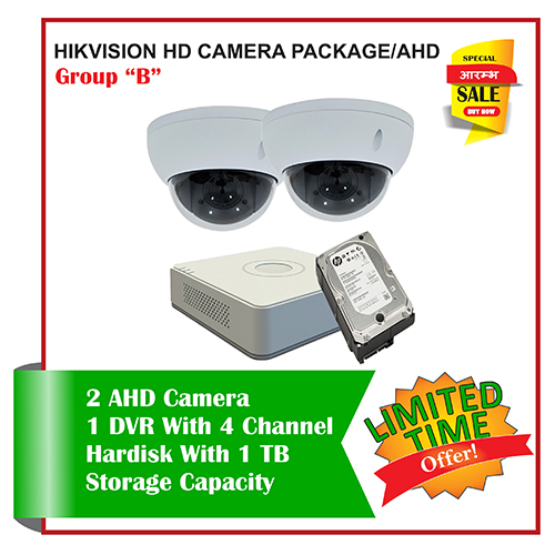 # Camera 1MP CMOS Sensor, 12 pcs IR LEDs,20m IR, Indoor IR Eyeball, ICR, 0.01 Lux/F1.2, 12 VDC, Smart IR, Wide operating temperature range (-40°~60°), 2.8/3.6/6mm Lens, Support TVI/AHD/CVI/CVBS video signal output # NVR (4CH) H.264th H.265 Codes Decoding Max 80 Mbps Incoming Band Width Up to 6Mp Resolution Preview & Playback HDMI (VGA Simulation Video Output. # Hard Disk (1TB) Device Type : 3.5 Inch HDD Drive Capacity : 1TB Interface : Sata 6.0 Gbps Cable Power Consumption : 3.3 w.