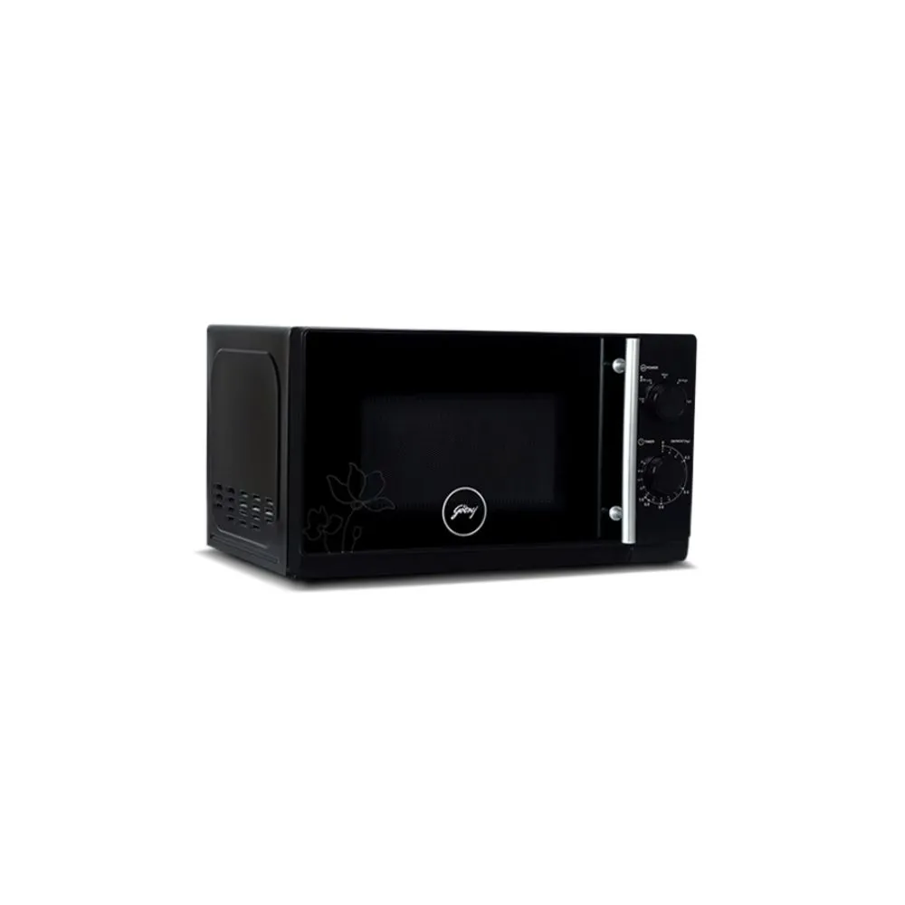 Design: Features a sleek black design with a pull handle door and toughened glass turntable.